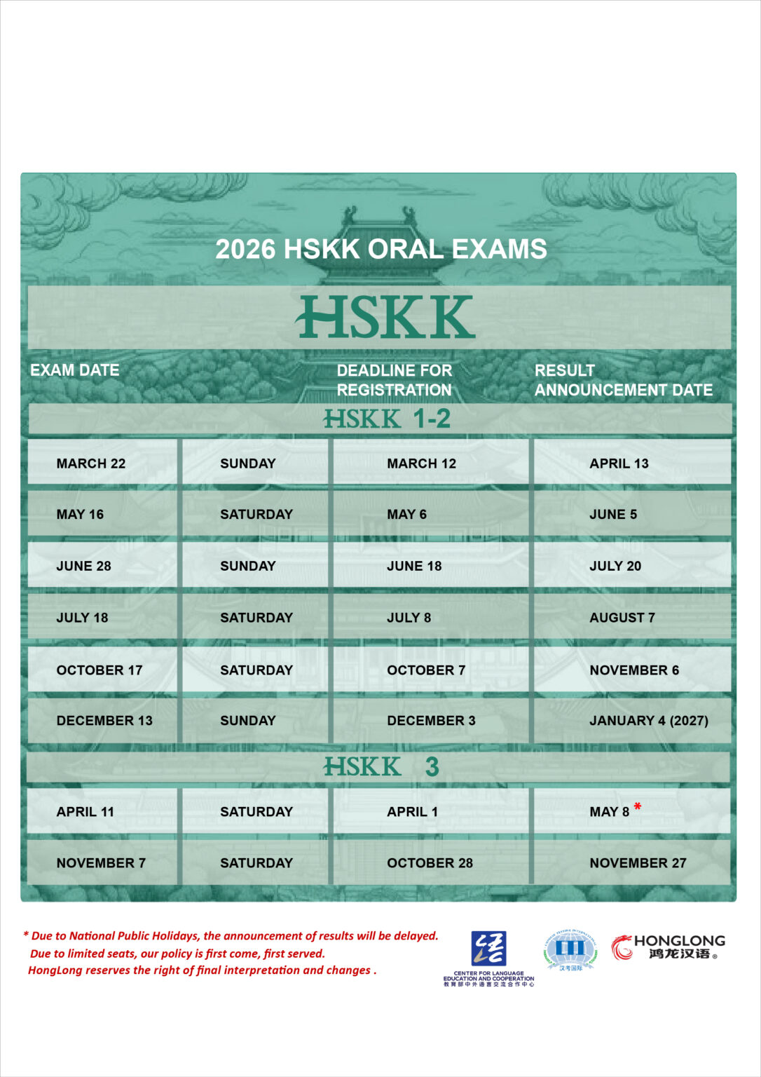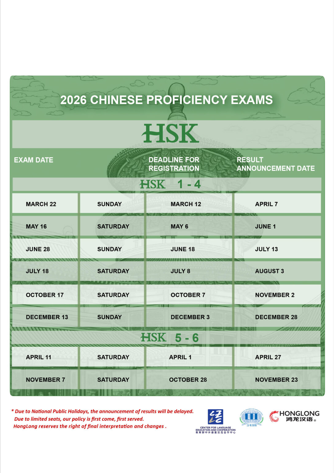 Below you can find all available exam dates for the HSK, HSKK, BCT & YCT exams for the year 2026, as well as registration deadlines.